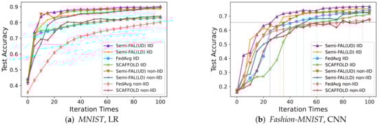 Datasets: We choose two classical image classification datasets, MNIST (http://yann.lecun.com/exdb/mnist/, accessed on 26 August 2022) and Fashion-MNIST (https://github.com/zalandoresearch/fashion-mnist, accessed on 26 August 2022), to evaluate the performance of our semi-FAL. MNIST is a handwritten digit dataset containing 60,000 training instances and 10,000 test instances. The Fashion-MNIST dataset consists of 60,000 greyscale images in 10 classes, with 6000 images per class. To investigate the robustness of our proposed framework for non-IID data, two data setting schemes are given: (1) IID setting: an equal amount of data is allocated to each client randomly. (2) Non-IID setting: to simulate non-IID data, the dataset is always divided and distributed to clients manually. In our design, the data are sorted via labels and then two classes of data are assigned to each client. Note that, to simulate the sequential data in an online network, we control the local data of each client increasing constantly.