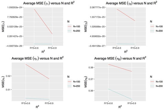 With respect to the MSE of both the functional covariates and the response, we investigated the effect of increasing the sample size and on these values of . If these were increased, would , , , , and decrease or not? In this scenario, the following criteria were computed: where is the estimate of and each observed predictor is sampled at the same p locations, . Similarly, , , were computed; however, the calculation of was different because of its discrete characteristics and it was computed as where denotes the model fitted values of the true .