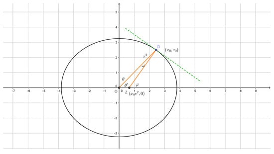 Let D = (x0, z0) be an arbitrary point on the ellipse (see Figure 1). We consider point Z with coordinates (x0e2, 0), whose position is illustrated in Figure 1 (e is the first eccentricity of the ellipse).