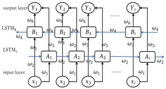 A Bidirectional Long Short-Term Memory (BiLSTM) neural network is an optimized improvement of LSTM [27]. While the traditional LSTM predicts the next moment’s output by past time series information, BiLSTM can fully take into account past and future information by connecting a forward LSTM layer and a backward LSTM layer, which facilitates both forward and backward sequence information input, thus making the model more robust [28]. Therefore, this paper used the BiLSTM neural network to learn the bi-directional serial features from the feature information extracted from the CNN layer, fully exploit the long-term dependent features of the sample data for learning, and finally output the stock price prediction results through the fully linked layer. The BiLSTM structure is shown in Figure 2.