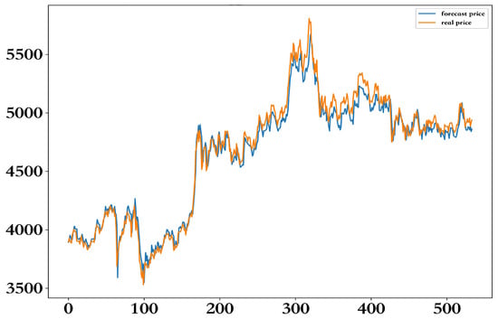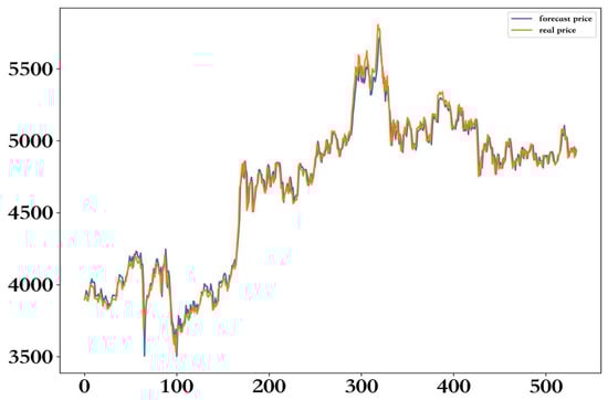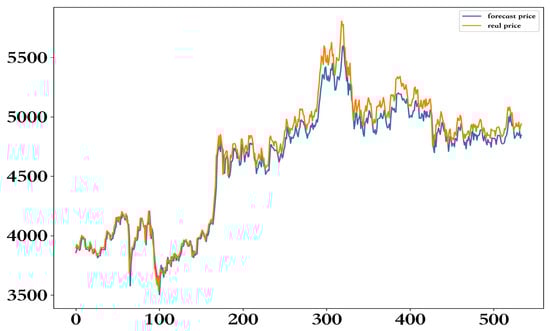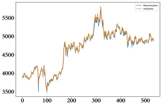 where , , and are the predicted stock value, the real stock value, and the average forecast value at i time, respectively, and n represents the total number of test samples. A smaller value of MAPE or RMSE represents a more accurate stock price prediction, while takes values in the range of , and in general, the closer the value of to 1, the better the model fits.