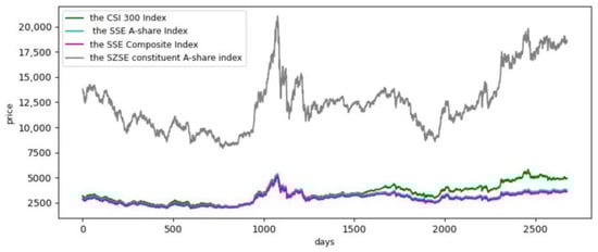 The figure shows that the four selected stock indices generally have similar trends, especially the SSE A-share Index, SSE Composite Index, and CSI 300 Index. The normalization would eliminate the effect of the magnitude, and the hyperparameters used in the prediction would remain unchanged.