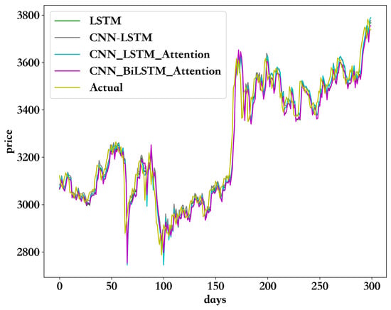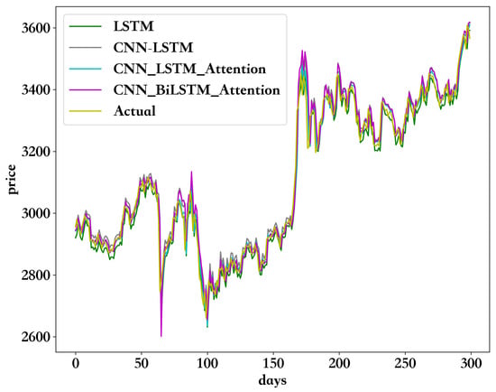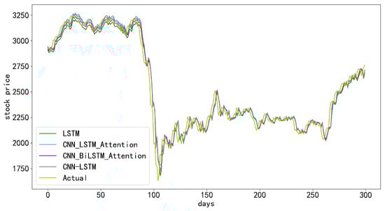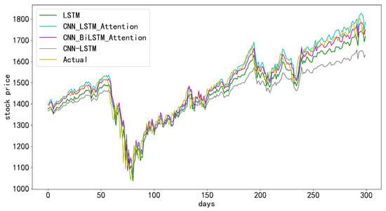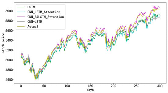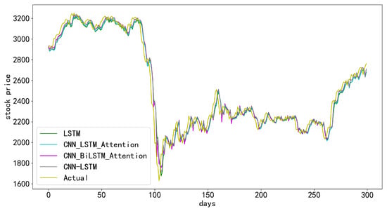 From Table 1, it can be seen that the prediction accuracy ordered from high to low is the CNN-BiLSTM-Attention model, CNN-LSTM-Attention model, CNN-LSTM model, and LSTM model, respectively. The RMSE of the CNN-BiLSTM-Attention model to predict the closing price of the CSI 300 Index is 64.84, which is lower than single LSTM, CNN-LSTM, and CNN-LSTM-Attention by 43.9, 24.2, and 11.606, respectively. In terms of MAPE, the CNN-BiLSTM-Attention model, compared with the LSTM model, CNN-LSTM model, and CNN-LSTM-Attention model, reduced by 0.854%, 0.459%, and 0.265%, respectively, further quantitatively verifying the rationality and effectiveness of the CNN-LSTM-Attention model proposed in this paper.