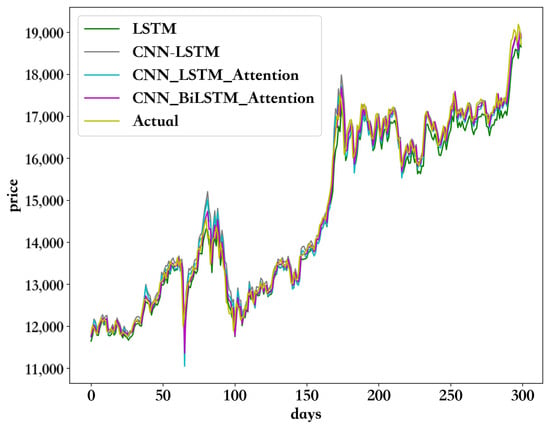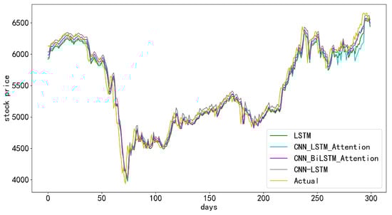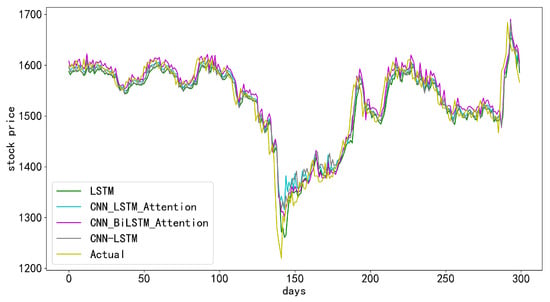 To save space, the comparison of the prediction of each index mentioned above by the chosen four models is plotted in one figure. The meaning is similar to the explanation given above—the closer the curve of a model to the actual curve, the better the model. The prediction results are shown in Figure 9, Figure 10 and Figure 11, respectively. It can be seen that the CNN-BiLSTM-Attention model has good generalization ability and good robustness. However, the local prediction accuracy of the model decreases at the spikes in the stock price.