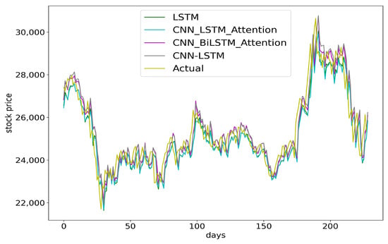 The comparisons of the prediction results of these indices are shown in Figure 12, Figure 13, Figure 14, Figure 15, Figure 16, Figure 17, Figure 18 and Figure 19, where the meaning for each figure can be explained similarly to the previous ones. The curve of the predicted results of the CNN-BiLSTM-Attention model is closest to the curve of the actual data in general. That is, the CNN-BiLSTM-Attention model is the most accurate among these four models. Compared with the forecast results of the Chinese indices, the international indices have more lagging forecasts, which is probably related to the “T+1” trading system in China and the “T+0” system in the international markets.