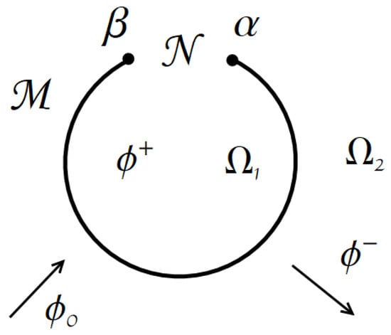 Consider the two-dimensional problem of a TE-polarized electromagnetic wave diffraction on a cylindrical resonator of circular cross-section of the radius , where are the polar coordinates of a point in the cross-sectional plane (Figure 1). The cross-sectional region occupied by the perfectly conducting (metal) surface is denoted by , which is a circular arc. We assume that the resonator boundary is infinitely thin and perfectly conducting.