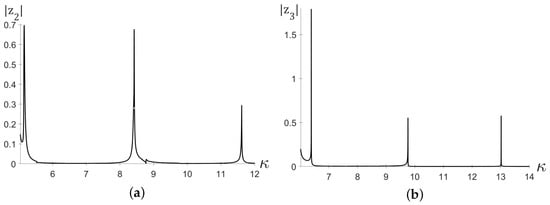 Figure 2 shows the resonance curves: the absolute values of coefficients and of the solution series expansion (6) plotted against spectral parameter . It can be seen that the moduli of the coefficients increase sharply in the neighborhood of the zeros of the Bessel functions , as it follows from the occurrence of RFs , , close to these points for narrow slots; sharp peaks correspond to the real values .