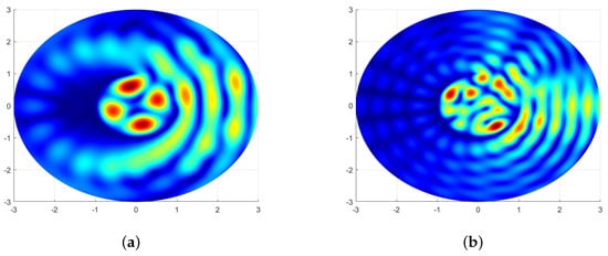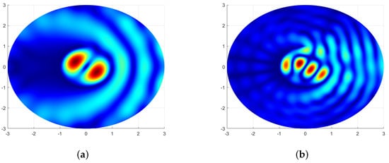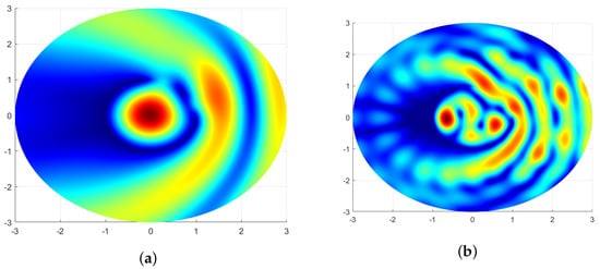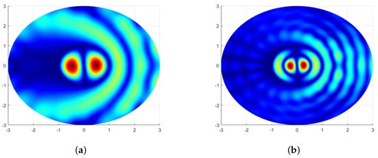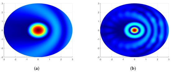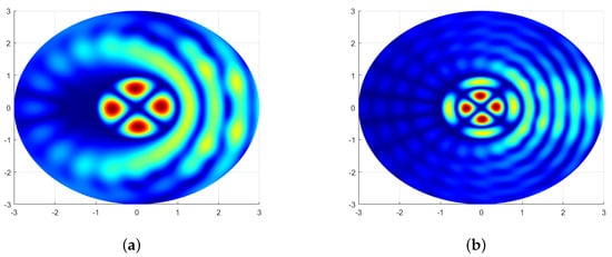 Figure 4, Figure 5 and Figure 6 show the graphs of the amplitude of the electromagnetic field component in the cross-section of the circular slotted scatterer for the and lowest modes: Similar graphs are shown in Figure 7, Figure 8 and Figure 9 at .