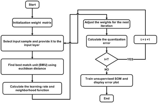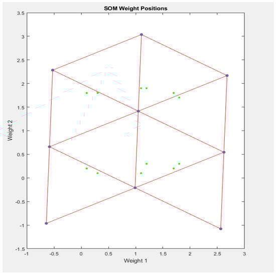 A self-organization map (SOM) is a type of ANN that is taught using unsupervised learning to generate a small, discernible representation of the training samples’ input space, called a map, which is a way to reduce dimensionality. Moreover, SOM mapping processes begin with weight vector initialization. Every weight vector has neighboring weights that are close to it. The picked weight is rewarded by the fact that the randomly picked sample vector is more similar. The neighbors of that weight are also rewarded by being able to become more like the chosen sample vector. Furthermore, SOM is defined as an unsupervised class based on competitive learning, where the output neurons compete amongst themselves to be activated [3]. Meanwhile, back-propagation is applied in supervised learning to learn the weights of a multi-layer neural network with a fixed architecture. A network forward propagation of activation produces an output and a backward propagation produces an error to find the weight changes. In the study, the incrementing number of hidden neurons leads to the better approximation in the SOM and more neurons are used in SOM compared to back-propagation. Moreover, there is less risk of local minima, stable convergence, and faster training. The SOM may be considered a good tool for classification and clustering processes. Generally, the SOM consists of two layers, the input layer and the output layer. The difficulties faced when deploying SOM algorithm are that in the normalization of the input’s space, the classifications lose their precision and the neurons cannot differentiate between the original inputs. Moreover, the standardization of the input vectors may provoke serious problems if a similarity or linearity between the inputs parameters are detected. To overpass this inconvenience, the use of supplementary tools that can handle the input’s space without affecting the classification ability, such as PCA, is required [23]. The SOM toolbox has been introduced as a tool in the visualization of high-dimensional data. However, the SOM toolbox generally facilitates the utilization of the SOM algorithm, encompassing data formatting, construction, preprocessing, initialization, and training using SOM. The default topology of the SOM is hexagonal [24,25].