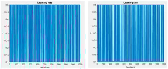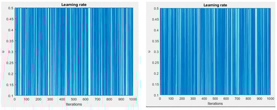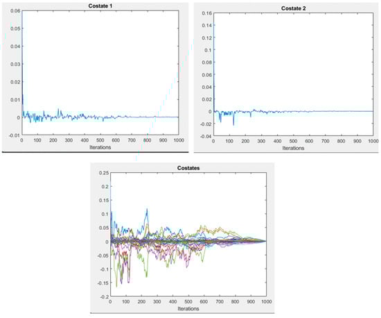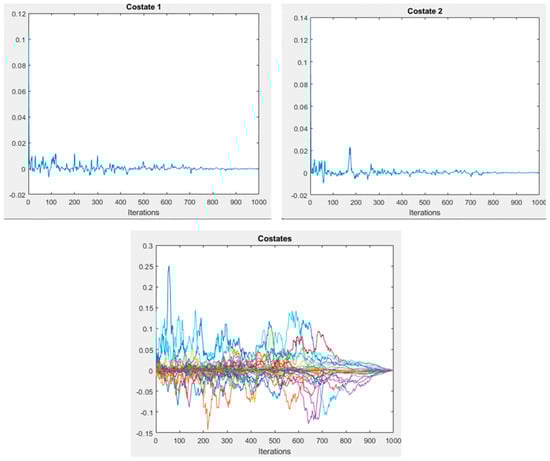 The map size chosen for this dataset is 12 × 12 with 1000 iterations. The formulated equations of the SOMOC1 and SOMOC2 algorithms are discussed in Section 3.2. SOMOC1 has T values of 788 and on the other hand, the SOMOC2 algorithm has 788, 12, and 12 for T, N, and M, respectively. The values for the costates were found using the ODE45 function in MATLAB, and those values are used to find the values of the switching function. Based on the values of the switching function, the minimum and maximum learning rate, or the control variable were supplied to the training algorithms. The comparison quantization errors of CSOM, SOMOC1, and SOMOC2 based on the aggregation dataset are illustrated in Figure 6 and the switch functions, control variables, and costates are shown in Figure 7, Figure 8 and Figure 9, respectively. Figure 9 shows the costate variable of SOMOC1 and SOMOC2 based on aggregation dataset, it can be observed that costate of SOMOC2 includes all possible values of costate which is represented in different color