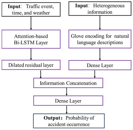 However, the data attributes that are related to traffic accidents are rather complex and heterogeneous. Factors such as geographical location, road network, traffic patterns, weather conditions, and specific areas of interest need to be considered in traffic accident prediction. Road characteristics, such as road types, road design, and road infrastructure, also influence the occurrence and severity of traffic accidents. Additionally, traffic conditions, such as traffic volume, traffic density, traffic speed, time period, and traffic congestion, can impact the likelihood of traffic accidents. Simply combining multiple deep learning modules might not effectively handle multi-source information. While recurrent neural network (RNN) architectures, including long short-term memory (LSTM), are commonly used for time series prediction, the problems of gradient explosion and vanishing remain unresolved. Moreover, the model output is primarily influenced by the nearest time series input. In contrast, a dilated convolutional network can build deep convolutional connections to extract higher-order hidden information and large convolutional kernels to extract features over long periods. This allows for the indirect expansion of convolutional kernels without increasing computing costs [6,7]. To improve accident prediction accuracy, we propose a novel deep learning method called attention-based residual dilated network (ARDN). This method utilizes LSTM to model sequence relationships and an attention mechanism to focus on key information. The dilated residual network is designed to extract complex feature information. Finally, the dataset of natural language descriptions and points of interest is fused through information encoding. We conducted experiments on datasets collected from Austin and Houston, and compared this method with a series of machine learning and deep learning methods to verify its validity. The highlights of this work are as follows:
