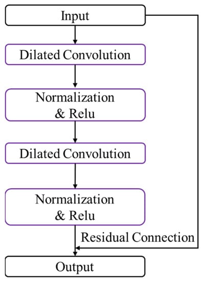 Although LSTM is designed to retain important information in its memory gate, convolutional neural networks (CNNs) have shown promise in retaining long-term memories in a more realistic manner. For instance, models such as WaveNet [6] and temporal convolutional networks (TCNs) [7] have demonstrated better performance than RNNs and LSTMs based on a range of datasets. The dilated residual layer is a key component that combines dilated convolution and residual connection to achieve high performance in sequence modeling tasks, as shown in Figure 4.