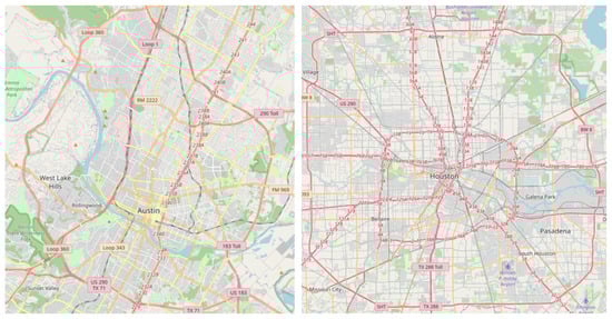 This study aims to predict the probability of traffic accidents occurring within a specific 15 min window. The datasets used in this study was obtained from the website: https://smoosavi.org/datasets/ (accessed on 1 June 2022). The data were collected from multiple data providers, including several APIs that provide streaming traffic event data. These APIs capture and broadcast traffic events from various sources, such as the US and state Departments of Transportation, law enforcement agencies, traffic cameras, and traffic sensors within the road networks [37]. The datasets provide detailed information on each geographical region with a size of 5 km × 5 km per 15 min interval in Austin and Houston [33]. Figure 5 depicts the road networks of the two cities, which was obtained from the website: www.openstreetmap.org/ (accessed on 15 April 2023). They include various traffic-related events occurring during the current interval, such as traffic events, time, and weather attributes. To predict the label of the next time interval, the time series information of the last eight time intervals, i.e., two hours, is adopted in this work.