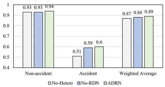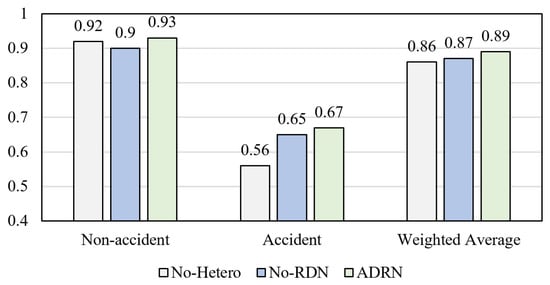 Furthermore, we conducted ablation experiments to assess the effectiveness of the various components of our proposed method. For this purpose, we trained and evaluated two baseline models alongside our proposed method. The first baseline, named No-Hetero, is the proposed method without the natural language description of historical traffic events and point-of-interest information. The second baseline, named No-RDN, uses a fully connected layer instead of the dilated residual layer. The results of experiments are presented in Figure 6 and Figure 7. It can be observed that the proposed method ADRN outperforms the two baselines in terms of F1 scores for accident prediction. These results highlight the importance of the various components within the ADRN method and demonstrate that the dilated residual layer contributes to the improved performance. A dilated convolutional network can cover a larger area of the input data which increases the effective receptive field of the filter. Thus, it can expand the effective receptive field of the convolutional filters and allow the network to consider a broader local region.
