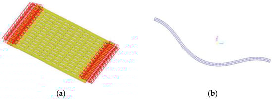 Finite element model of screen panel. (a) Meshes of screen panel; (b) Screen panel during translational motion simulation.