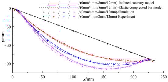 Both experiment and simulation of translational motion are carried out at n = 200 r/min, α = 20° and Δl = 0 mm. Eccentricity e is set to 6 mm, so slack amount (i.e., reduction of the linear distance between the two ends) can change from 0 to 12 mm. Then, the trajectory of the screen is measured under different slack amounts and compared with that calculated with the inclined catenary model and the elastic compressed bar model, as shown in Figure 4 and Table 1.