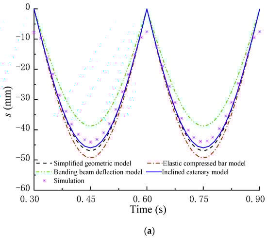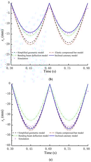 Figure 5 shows the midpoint displacement of the screen panel achieved using four theoretical models. The total displacement s, the transverse displacement sx and the longitudinal displacement sy go down and up periodically, which is approximately parabolic. Although possessing the same trend, the four theoretical models have different errors, as shown in Table 2. Compared with the simulation displacement, s calculated using the bending beam deflection model and the elastic compressed bar model has larger errors, sx calculated with the simplified geometric model and the elastic compressed bar model has larger errors, and sy achieved with bending beam deflection model has larger errors. However, all of s, sx and sy calculated with the inclined catenary model always agree well with the simulation displacement, which verifies a higher displacement prediction accuracy of the inclined catenary model.