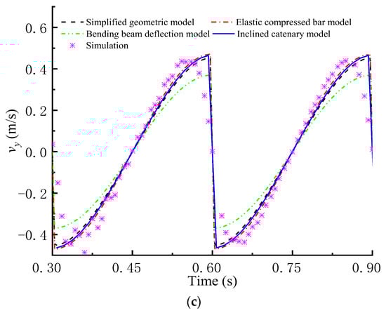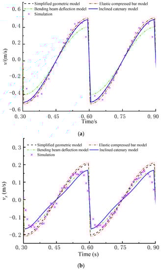 Figure 6 shows the midpoint velocity of the screen panel achieved with four theoretical models. The total velocity v, the transverse velocity vx and the longitudinal velocity vy all first rise slowly and then fall sharply, indicating that the velocities are discontinuous. Although possessing the same trend, the four theoretical models have different errors, as shown in Table 3. Compared with the simulation velocity, v achieved using the bending beam deflection model has larger errors, vx calculated with the simplified geometric model and the elastic compressed bar model has larger errors, and vy calculated with the bending beam deflection model has larger errors. However, all of v, vx and vy calculated with the inclined catenary model always agree well with the simulation velocity, which verifies a higher velocity prediction accuracy of the inclined catenary model.