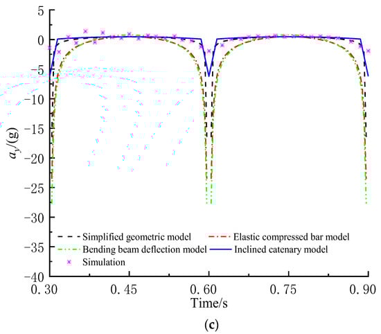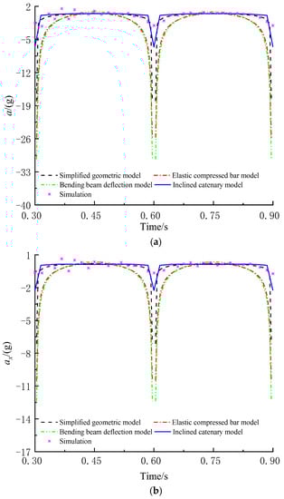 Figure 7 shows the midpoint acceleration of the screen panel achieved using four theoretical models. The total acceleration a, the transverse acceleration ax and the longitudinal acceleration ay are small in most of a period, while they change sharply in the time between two adjacent periods. Although possessing the same trend, the four theoretical models have different errors, as shown in Table 4. Compared with the simulation acceleration, all of a, ax and ay achieved with the simplified geometric model, the bending beam deflection model and the elastic compressed bar model always have much larger errors, which even approach infinity at time between two adjacent periods. However, all of v, vx and vy calculated with the inclined catenary model always agree well with the simulation acceleration, which verifies a higher acceleration prediction accuracy of the inclined catenary model.