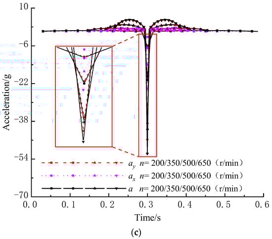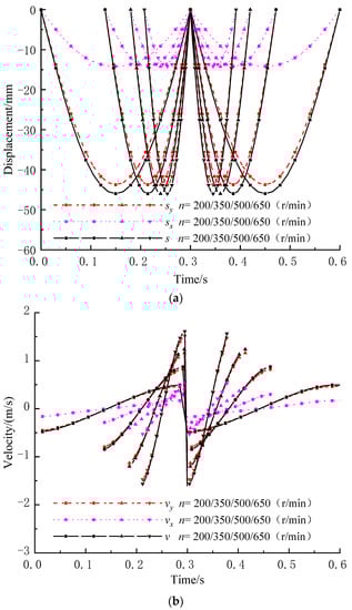Kinematic characteristics of the midpoint under different rotation speed n. (a) Displacement; (b) Velocity; (c) Acceleration.