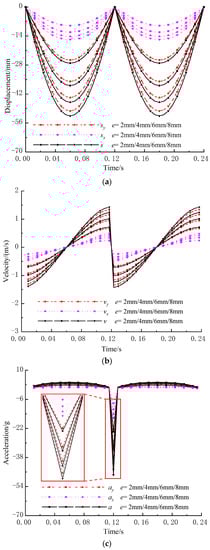 Overall, with the increase in e, the absolute value of displacement, velocity and acceleration increases. Moreover, large e will lead to short screening time and small e will lead to low vibration intensity, both of which are unfavorable to high screening efficiency and large flow rate of viscous particles. So, a reasonable e should be selected for both enough screening time and high vibration intensity.