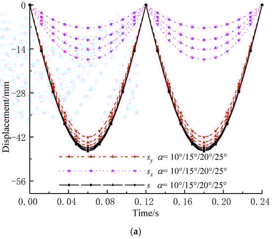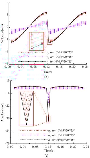 When α, Δl and e are 500 r/min, 0 mm and 6 mm, respectively, displacement, velocity and acceleration of the midpoint change with α, as shown in Figure 10. In addition, s, sx and sy are still W-shaped, and the absolute value of sy is still slightly smaller than that of s and is still larger than that of sx. With the increase in α, the curve of s almost remains unchanged, while the absolute value of sx increases slowly and the absolute value of sy decreases slightly. Additionally, v, vx and vy are still N-shaped, and the absolute value of vy is still slightly smaller than that of v and is still larger than that of vx. With the increase in α, the curve of v almost remains unchanged, while the absolute value of vx increases slowly and the absolute value of vy decreases slightly. Furthermore, a, ax and ay are still umbrella-shaped, the absolute value of ay is still slightly smaller than that of a and is still larger than that of ax. With the increase in α, the curve of a almost remains unchanged, while the absolute value of ax increases slowly and the absolute value of ay decreases slightly.