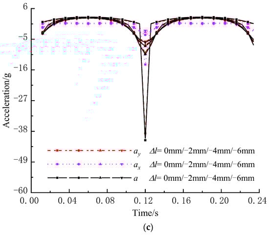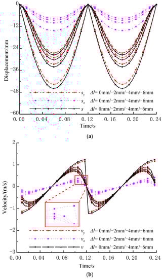 When n, α and e are 500 r/min, 20° and 6 mm, respectively, displacement, velocity and acceleration of the screen midpoint change with Δl, as shown in Figure 11. In addition, s, sx and sy are still W-shaped, and the absolute value of sy is still slightly smaller than that of s and is still larger than that of sx. With the increase in Δl, the period of s, sx and sy remains unchanged, and the absolute value of s, sx and sy increases rapidly. Additionally, v, vx and vy are still N-shaped, and the absolute value of vy is still slightly smaller than that of v and is still larger than that of vx. With the increase in Δl, the period of v, vx and vy remains unchanged, and the absolute value of v, vx and vy increases slowly. Furthermore, a, ax and ay are still umbrella-shaped, the absolute value of ay is still slightly smaller than that of a and is still larger than that of ax. With the increase in Δl, the period of a, ax and ay remains unchanged, and the absolute value of a, ax and ay increases rapidly, especially a and ay.