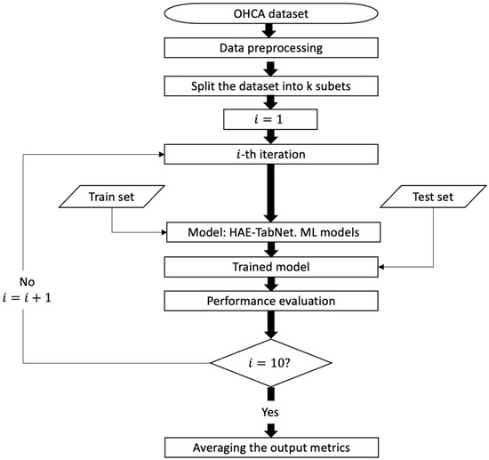 In this research, the HAE-TabNet model was built by pytorch_tabnet version 4.0. Figure 2 depicts a schematic representation of the model process. Specifically, we used the stratified 10-fold cross-validation (CV) technique to assess the quality of machine learning models. When employing a k-fold CV, the dataset is divided into k sections of equal size, and cases are selected at random for each section. Each subgroup is divided into a part for training and a reminder for the test set. During the k evaluations of the model, each group is used once as the test set. Each subset is split into groups with roughly the same class labels as the initial dataset during stratified k-fold cross-validation.