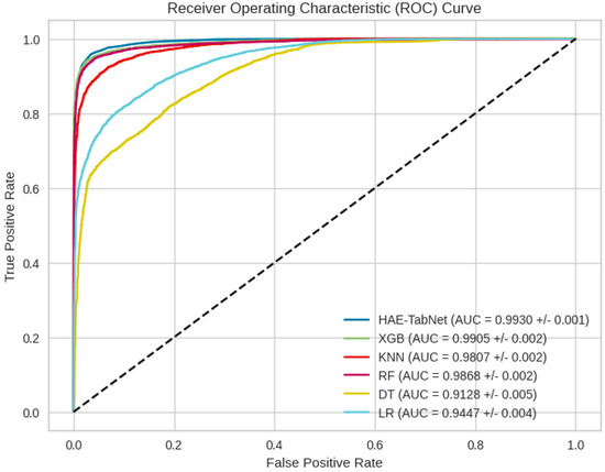 Table 3 demonstrated that the ROC AUC of XGB, KNN, RF, DT, and LR were 0.9909 ± 0.001, 0.9854 ± 0.001, 0.9894 ± 0.001, 0.9205 ± 0.003, and 0.9469 ± 0.003, respectively. On the test set, the HAE-TabNet model’s ROC AUC was also higher than other machine learning models, with a value of 0.9930 ± 0.001 displayed in Figure 3. The ROC AUC of the HAE-TabNet outperformed all other benchmark models on both the training set and the test set. Moreover, the HAE-TabNet model also had the highest accuracy on the training set.