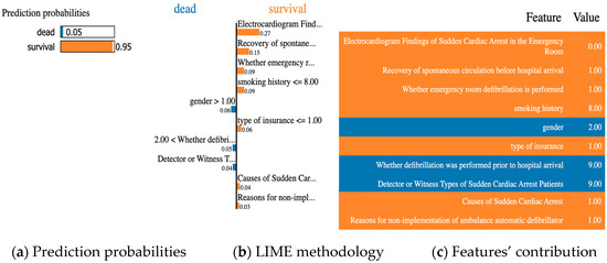 Based on this patient’s state, the HAE-TabNet predicted that the survival rate would be 95%, as shown in Figure 5a. Figure 5b depicts the LIME methodology. The blue bars represent the variables that significantly contribute to the prediction’s rejection, whereas the orange bars represent the states and factors that considerably contribute to the prediction’s support. According to the explanation, at the time of the prediction, “Electrocardiogram Findings of Sudden Cardiac Arrest in the Emergency Room” was the target’s main factor and state that most contributed to the prediction, with a weight of 0.27.