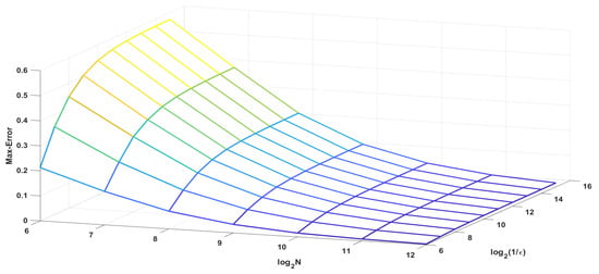 We evaluated the test problems in terms of their maximum pointwise errors, presented in Table 1 and Table 2. From the tables we see that the computational order of convergence was almost one, but Theorem 2 showed second-order convergence in space and first-order convergence in time. This was due to the first-order term in the final result. Our results demonstrated that the maximum pointwise error stabilized as parameter decreased and decreased as parameter N increased.