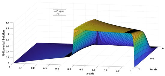 Table 2 presents the maximum point-wise error and the associated convergence rate for Example 2, when M = 50. The CPU run time for the error given in the table was s. Additionally, as illustrated in Example 1, the graphs of numerical solution and point-wise maximum error of the problem are illustrated in Figure 3 and Figure 4, respectively.