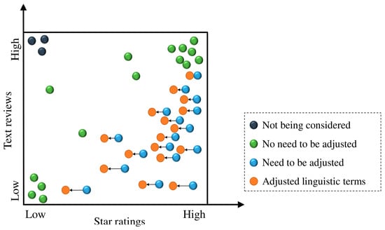 Figure 2. Firstly, this study excludes the case of low-star but positive text reviews, which is also rare. Secondly, linguistic terms are acceptable in the case of high-star and positive text reviews or low-star and negative text reviews, which do not require adjustment. Finally, those linguistic terms for high-star but negative text reviews need to be adjusted. In other words, when the text content of the high star rating is negative, the high star rating needs to be down-adjusted. The adjustment rules are shown in