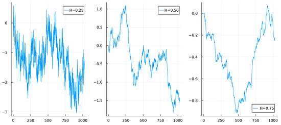 Next, we consider the properties of the fBM over time for different Hurst parameters. Suppose or . If we assume that the Hurst parameter is of , we say the fractional stochastic process has a short memory. Conversely, if , we obtain the property of long-range dependence. Figure 1 illustrates sample processes for the three ranges of the Hurst parameters, H.