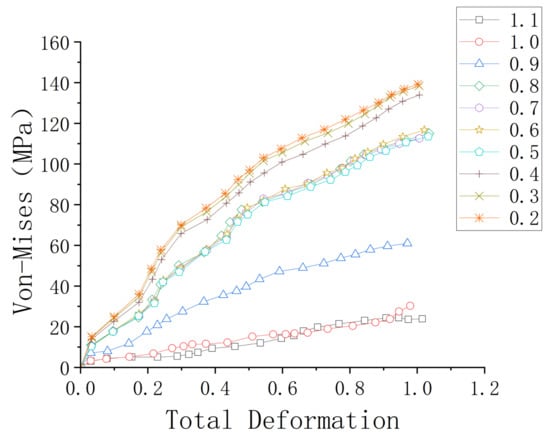 The stress under different ratios of straight wall to inclined wall is shown in Figure 12. The geometric parameters are = 60°, l = 10 mm, t = 20 mm and b = 10 mm, and the material parameters are Es = 69 MPa. The ratio of honeycomb straight wall to inclined wall is adjusted to 1.2, 1.5, 1.8 and 2.4. Different straight wall lengths have little effect on the deformation of the honeycomb. The main deformation of the honeycomb is achieved by the deformation of the inclined wall, so the inclined wall bears most of stress.