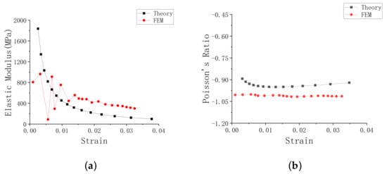 Comparison of theoretical and finite element results. (a) Young’s modulus, (b) Poisson’s ratio.