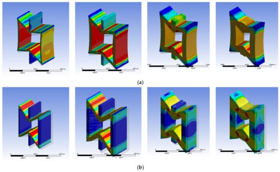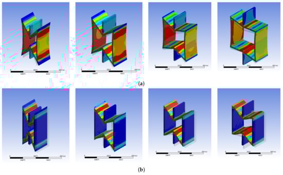 Considering four honeycomb angles as 30°, 45°, 60° and 75°, the remaining geometric parameters are l = 10 mm, h = 20 mm, b = 10 mm and t = 1 mm. The material parameter is Es = 69 MPa. A displacement of 2 mm is given to analyze the influence of cell angle change on the equivalent parameters of the honeycomb. The stress cloud of the honeycomb cell is shown in Figure 6. It can be seen that the deformation of the honeycomb cell with different cell angles shows a negative Poisson’s ratio effect. The strain at the node position connected by the straight wall and the inclined wall is the largest and the inclined wall bears the main deformation.