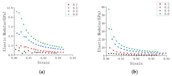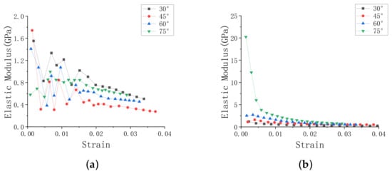 Figure 7 shows the change of the Young’s modulus of the honeycomb cell under different cell angles when the honeycomb cell is loaded in y and x directions, respectively. It can be seen from Figure 7a that when the honeycomb is loaded in the y direction, the Young’s modulus begins to stabilize after the strain is greater than 0.01, and the Young’s modulus of 30° is the largest while the Young’s modulus of 45° is the smallest. The variation of Young’s modulus with strain is roughly the same at different honeycomb cell angles. It can be seen from Figure 7b that the negative Poisson’s ratio honeycomb with 75° cell angle shows different trends when loaded in the x direction. This is mainly because the cell angle is too large, the overall structure of the honeycomb is close to the square during the stretching process. The stress cloud changes as shown in Figure 6b.