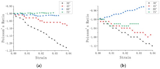 Figure 8 shows the variation in Poisson’s ratio with honeycomb cell angle. It can be seen from Figure 8a that when loaded in the y direction, the Poisson’s ratio gradually decreases as the strain increases, and the Poisson’s ratio of the honeycomb cell gradually decreases as the cell angle decreases. When the cell angle is less than 45°, the decreasing trend of Poisson’s ratio is more obvious. When the angle is greater than 45°, the decreasing trend of Poisson’s ratio is not obvious. It can be seen from Figure 8b that when loading in the x direction, the Poisson’s ratio of honeycomb with cell angles of 60° gradually increases with the increase of strain, while the Poisson’s ratio of honeycomb with other cell angles gradually decreases.
