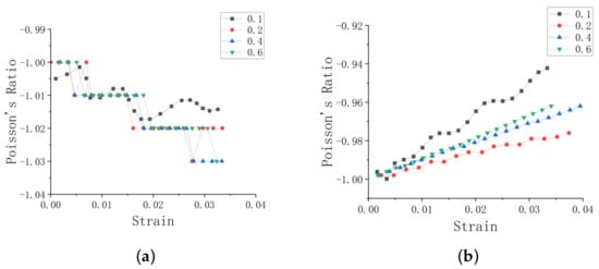 The change of Poisson’s ratio under different thickness-to-length ratios is shown in Figure 11. Figure 11a shows that the Poisson’s ratio of the honeycomb decreases gradually with the increase of strain. As the thickness-to-length ratio increases, the Poisson’s ratio of the honeycomb gradually decreases. Figure 11b shows the effect of the thickness-to-length ratio on the Poisson’s ratio of the honeycomb loaded in the x direction. As the strain increases, the Poisson’s ratio gradually increases. When the thickness-to-length ratio is greater than 0.2, the Poisson’s ratio of the honeycomb increases gradually.