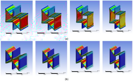 The honeycomb thickness-to-length ratios t/l are 0.1, 0.2, 0.4 and 0.6, respectively. Other geometric parameters are = 60°, l = 10 mm, h = 20 mm and b = 10 mm, and the material parameter is Es = 69 MPa. The deformation of the honeycomb cell loaded in two directions is shown in Figure 9. It can be seen from Figure 9a that the stress value inside the honeycomb is the largest, and the diffusion to the periphery gradually decreases. The symmetrical deformation of the inclined wall is more obvious when loading in the x direction.