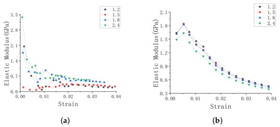 Figure 13 is the result of the Young’s modulus when the honeycomb is loaded in both y and x directions. With the increase of strain value, the Young’s modulus of honeycomb decreases gradually. In the case of y-direction loading, the Young’s modulus of the honeycomb is the largest when h/l is 2.4. When the load is in x direction, the Young’s modulus of the honeycomb decreases with the increase of h/l. However, the above trend is not obvious. This is because the length of the straight wall increases, the length of the inclined wall does not change and the main deformation of the honeycomb depends on the bending deformation of the inclined wall—so the change of Young’s modulus is not obvious.