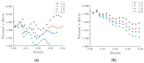 Figure 14 shows the Poisson’s ratios of honeycombs with different ratios of straight and inclined walls. The Poisson’s ratio of honeycomb decreases with the increase of the ratio of straight wall to inclined wall. The difference between the maximum Poisson’s ratio and the minimum Poisson’s ratio is 0.02 in the y direction, as shown in Figure 14a. The change of the Poisson’s ratio in the x direction is larger, and the difference between the maximum Poisson’s ratio and the minimum Poisson’s ratio is 0.06, as shown in Figure 14b.