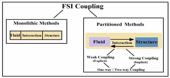 In contrast, partitioned approaches solve fluid and solid structure sub-problems separately according to the numerical solver and mesh discretization using an iterative process so that the computation of the fluid flow solution does not affect the solid structure solution at the same computing time. It is not only used in the FSI but the idea can be applied to different problems and situations. Partitioned approaches are traditionally adopted in engineering applications since it is easy to combine available solvers for fluid and solid mechanical problems. The development of partitioned numerical approaches has been extensively studied in the literature [,,,,,,,,,,,,], which contains fixed-point iterations [,,], Newton-like methods [,,], or optimization techniques [,,]. In this approach, the interfacial conditions of fluid and solid structure are usually considered explicit, and the information is exchanged at the interface according to the coupling technique []. However, the challenge of this approach is to coordinate the disciplinary algorithms for achieving accurate and efficient FSI solutions with minimal code modification. Partitioned approaches are divided into one-way and two-way coupling approaches, while two-way coupling is further classified into weakly and strongly coupled approaches. An overview of monolithic and partitioned approaches of the FSI is given in Figure 2.