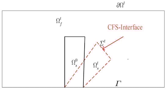 In the present CFSI problem, is the time-dependent computational domain, which comprises fluid region and solid region , respectively, such that The boundary of the computational domain and fluid–structure interface is denoted by and , respectively, where The time-independent is taken as the part of the boundary of the computational domain on which either the solid structure clamps or it satisfies the ‘no-slip condition’ on the fluid. At , the configuration is called the reference or undeformed configuration, and we assume that the system is at rest, i.e., . The fluid is driven by an inflow boundary data on , and the fluid’s stresses on the solid structure cause a deformation after some time in the deformed or the present configuration. Further, fluid and solid domains are prescribed initially as and , respectively, in this modeling. A schematic of this CFSI description can be seen in Figure 3.