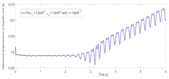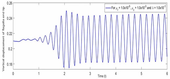 There is a wealth of literature available on the numerous numerical approaches for solving FSI problems inside a traditional classical framework. Some numerical approaches are known as monolithic [,,,], where fluid dynamics and structural dynamics are treated inside the same mathematical variational formulation. In recent years, from the modeling point of view, monolithic approaches have been adopted extensively for solving FSI problems in many different fields of engineering and applied sciences. Meanwhile, the development of monolithic solvers in the solution procedure for solving such coupled problems all at once is considered, in general, a very hard task and has received a lot of attention. The main advantage of using this approach is that the implicit interfacial conditions are inherently present in the solution procedure of the formulated mathematical framework, and a single discretization scheme can be applied to the proposed problem [,]. The monolithic approach has also the advantage of stability since the mutual influence of fluid and solid structure can be taken into account directly. This approach can potentially achieve the desired accuracy for a multidisciplinary problem under consideration by requiring substantially more resources and expertise in developing and maintaining such specialized code []. A more recent work devoted to monolithic approaches can be seen in [,,,,,,,,,,,,,], and a comprehensive review of the recent developments of robust monolithic FSI solvers can be found in []. Among them, a monolithic approach in an Eulerian frame [,] works like the fully Eulerian formulation [,]. This monolithic Eulerian approach is well adapted to FSI problems of finite structural displacement in physically deformed configurations. Further, this numerical approach works with velocities everywhere in the proposed problem domain, while the fully Eulerian formulation [,,,,,] prefers to work with velocities in fluid and displacement in solid domains, respectively. Finally for obtaining energy stability, it is suggested to update the solid structure with its own velocity and remesh the fluid domain at every time step [,].