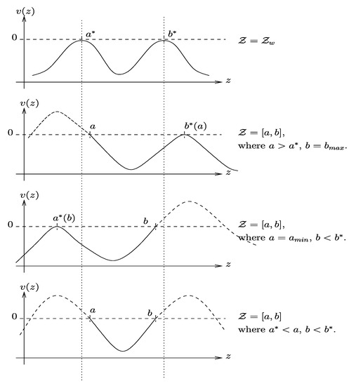 To start, let us look at the function : For , , (Table 6). This means that is concave increasing from up to 0 with an infinite derivative at . For , , , and . Therefore, for is concave increasing from to zero with an infinite derivative at while for , is convex increasing from zero to ∞ with a zero derivative at . For , is convex decreasing. We can then argue that an upward sloping line can cross at most twice in the cases , , ; , . As a consequence, has at most two TP’s, one a maximal TP, and one a minimal TP. Thus, only two support points are possible on any .