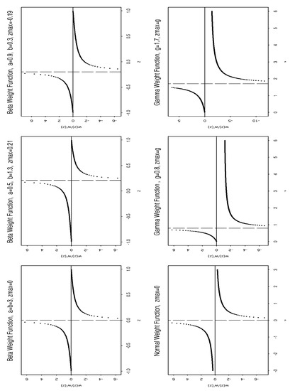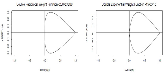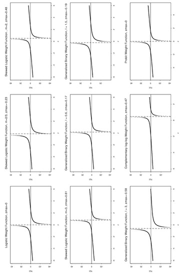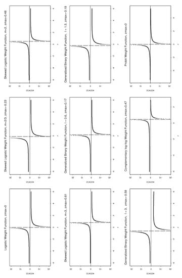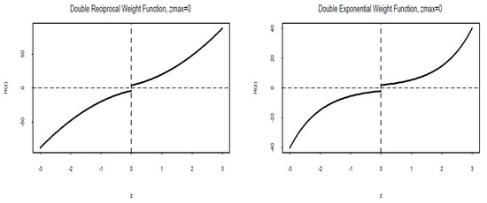 For some of these functions, the stronger outcome of the ratio increasing over and over has also been demonstrated (such as in the cases of the logistic, complementary log-log, and skewed logistic binary weight functions). This implies that is log-concave. On the other hand, it has been analytically proven that is an increasing function for the remaining cases (probit, double exponential, double reciprocal). Figure 4 and Figure 5 represent a typical plot of . The examination of these plots reveals a prominent feature, which is that the functions and exhibit almost identical shapes and are increasing over and with a vertical asymptote at for the listed weight functions. These findings corroborate and extend the conclusions of Wu [26].