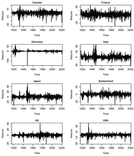 The stock index data for Canada (S&P TSX 300 Composite Index), France (CAC All-Tradable Index), Germany (CDAX Composite Index), Italy (Banca Commerciale Italiana Index), Japan (Nikkei 225 Index), Switzerland (All Share Stock Index), the UK (FTSE All Share Index), and the US (S&P500 Index), are all derived from Global Financial Data. (https://globalfinancialdata.com/ accessed on 12 October 2022)—as is the West Texas Intermediate (WTI) oil-price data. We compute log-returns in percentages for the stock and oil prices. Figure 1 plots the stock market returns.