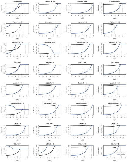 Full sample Lasso coefficients. Full sample lasso coefficients as a function of the shrinkage parameter. Black line = coefficient of temperature changes. Blue line = coefficient of temperature volatility. The temperature variables are based on changes in the northern hemisphere temperature anomaly and its volatility. Dashed vertical line = shrinkage parameter that minimizes the mean cross-validated error (10-fold cross-validation). The temperature variables are based on changes in the northern hemisphere temperature anomaly and its volatility. The parameter h denotes the forecast horizon.
